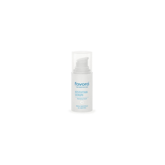 Favora Kosteuttava Seerumi on syväkosteuttava, kevyt ja erittäin hyvin imeytyvä seerumi päivittäiseen käyttöön. Seerumin sisältämä hyaluronihappo sitoo runsaasti vettä ja lisää ihon kimmoisuutta, sheavoin rasvahapot ravitsevat, suojaavat ja elvyttävät. Keramidit syväkosteuttavat kuivaa ihoa tehokkaasti ja antioksidanttinen E-vitamiini suojaa ihoa.